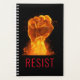 Der thematische Planer für soziale Gerechtigkeit zeigt eine große Faust von Feuer und Flammen mit anpassbarem "RESIST"-Text in roter, moderner Schriftart auf schwarzem Hintergrund.