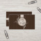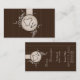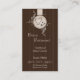 Dunkle schokoladenbraune und Vintage beige Kochs- und Restaurantgeschäftskarte. Diese Restaurantgeschäftskarte wird für Cafés, Bistros, Köche, Köche, Restaurants und die Nahrungsmittel- und Getränkindustrie entsprochen. Sie kennzeichnet einen Kreisrahmen mit dem Hut und einer Gabel eines Koch und Messer innerhalb des Rahmens. Der Rahmen hängt von einem Band und wird durch belaubtes Laub geschmückt. Der Hintergrund hat helle transparente Streifen. Fertigen Sie diesen Visitenkarteentwurf für Ihr Restaurant besonders an.
