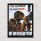 Anleihen waren ein wichtiger Teil der Kriegsanstrengungen und halfen, die gewaltige Schulden zu finanzieren, die notwendig war, um das Militär und Amerikas Verbündete zu stützen. Dieses Bild gleicht den Ankauf von Anleihen mit dem Kampf des Soldaten auf dem Feld in Bezug auf die Bedeutung. Dies ist eine wichtige Korrelation in der Welt der Propaganda, was impliziert, dass "auch du einen Einfluss haben kannst, selbst wenn du kein Soldat bist." Beachten Sie den eindrucksvollen Schieber und das Flugzeug, das er gerade niedergeschossen hat...alle möglich gemacht durch den Kauf von Kriegsanleihen.