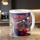Step back in time with this vibrant Retro 1950s Diner Neon Mug. The all-over wrap-around design captures the magic of classic Americana: two towering Frosty Shakes (strawberry and chocolate) topped with whipped cream, cherries, and striped straws sit beside a glowing jukebox blasting “Jukebox Tunes.” Neon signs glow with “RETRO DINER,” “OPEN 24HRS,” and “FROSTY SHAKES,” while red leather booths, checkerboard floors, and late-night diner vibes complete the nostalgic scene.