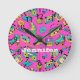 Retro 1980er Neon Pink Aquamarines Muster Pop Kuns Runde Wanduhr