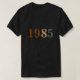 Black crewneck t-shirt celebrating the year "1985". The front graphic features the numbers in a vintage color palette including burnt orange, ochre, and sage green. The clean style and 80s-inspired colors make it an ideal birthday gift for those who love vintage aesthetics and minimalist yet colorful looks.