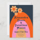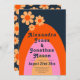 Mit dieser minimalistischen, blumengeschmückten Hochzeitseinladung aus den 1970er Jahren bringen Sie mit einer modernen Drehung einen Vintagen und feinen 70er in zartem Stil. Cooles Retro-Vintages Design mit zartem Regenbogenbogen in apricot-orangefarbener Mandarine, Rosa, Senfgelb und Navy Blau mit groovem Typografie-Skript, das mit den einfachen Vorlagen leicht zu personalisieren ist. Ideal, um den Ton für eine Sommerfrühlings- oder Herbsthochzeit zu setzen. Original-Kunstwerk von Catherine Sweetman