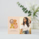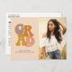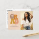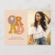 Diese lustige Abschluss-Postkarte hat eine moderne Einstellung zu Vintagem Design der 70er Jahre. An der Kartenvorderseite befinden sich 70er-Buchstaben auf dem links und ein vertikales Foto rechts. Die Retro-Typografie liest "Grad" in Rostorangefarben, das geerntete Gold, verblasste lila und staubige Rose rosa vor einem leicht pfirsichfarbenen Hintergrund. Der Name und die Schule des Absolventen sind unter der Typografie geschrieben, und das Abschluss-Jahr ist in der gesamten D in "Grad" geschrieben. Auf der Rückseite können Sie den Empfängern und/oder Graduiertengruppen eine Nachricht hinzufügen.