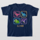 Dieser personalisierte T - Shirt aus der 90er-Jahre-Arkade bietet einen feinen Dinosaurier-Selektionsbildschirm mit vier chunky Pixel-Dinosaurier-Silhouetten. Jeder Dinosaurier befindet sich in einem gepixelten Rahmen, mit glitzernden Effekten für ein nostalgisches Retro-Ambiente.
