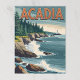 Das Retro-artige Naturposter des Acadia Nationalparks bietet schroffe Klippen, abstürzende Meereswellen und einen weit entfernten Leuchtturm, gerahmt von üppigen Pinienbäumen unter einem strukturierten Himmel. "ACADIA" wird oben mutig angezeigt.