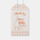 Wie Sie sehen, dieses einzigartige und elegante alberne Gänse orange Baby-Junge-Duschgeschenk-Tag hat eine gut konzipierte Vorlage. Mit orangefarbenen handgezogenen Gänsen und handgeschriebenen Namen und Datum in orangefarbener Schrift. Und blaue Rahmen blau karierte Quadrate. Alles auf cremefarbenem Hintergrund. Sie können diese einfach anpassen, indem Sie auf den Personalisieren-Button klicken.