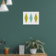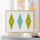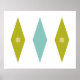 Dieses moderne Poster aus der Mitte des Jahrhunderts verfügt über 3 große Diamanten mit 2 Sternen in der Mitte, in einer Kombination der Farben Aqua blau, Avocado grün und gelb. Das würde einen Spaß machen an Ihren Wänden!