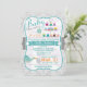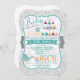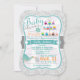 Niedliche, farbenfrohe aquamarine und orangefarbene Storchendusche mit Vintagem, hellgrauem Damastmuster. Rosa, Korallen, gelbe, blaue, grüne, lila, braune, weiße und orangefarbene Kuchen, lebhafte orange und gelbe Blume und pastellgrüner Storch. Ideal für die mädchenhafte Frühlingssaison Babyduschen! Vintage, elegante Klammer in Form einladen. Neutrale Einladung für Baby- oder Jungenduschen.