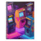 Eine Gruppe von Vintagen Arkadenmaschinen wird durch lebhafte Neonlichter beleuchtet. Die Szene ist Set vor dem Hintergrund einer Sternengalaxie, die eine nostalgische, aber futuristische Atmosphäre schafft.