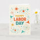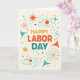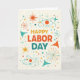 This lively Labor Day design bursts with mid-century Atomic Age energy and optimism. Set on a warm, lightly textured background, bold retro typography spells out “Happy Labor Day” in vibrant orange, golden yellow, and teal. Playful starbursts, atomic orbits, boomerang shapes, and confetti-like dots dance across the composition, evoking innovation, progress, and postwar American creativity. The upbeat color palette and graphic simplicity give this artwork a cheerful, modern-vintage feel.