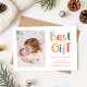 Feiern Sie Ihren neuesten kleinen Segen mit dieser modernen und spielerischen Geburtankündigungs-Feiertagskarte. Mit einem farbenfrohen „Bestes Geschenk“-Design und Platz für das Foto Ihres Babys wird die Freude über die Ankunft zu Weihnachten perfekt eingefangen. Ideal, um den Namen Ihres Neugeborenen, die Geburtsdetails und die erste Weihnachtsgrüße mit lieben Menschen zu teilen. Fügen Sie Ihren individuellen Text hinzu, um ein Erinnerungsstück voller Wärme und Freude zu schaffen. Personalisieren Sie Ihre heute.
