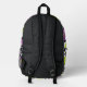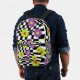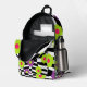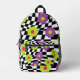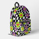Go back to school in style with this checkered flower print backpack. Fun book bag features a cool mod style pattern of purple , lime green , and pink flowers against a crooked black and white checkered background. , with black details. Original digital artwork by Buttercup's Clothing and Collectables.