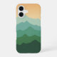 Ein geschichtetes Retro-Bergdesign mit flachen, gedämpften Farben und einfachen Silhouetten.