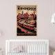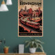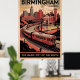 Eine Vintag inspiriert Reiseplakatbild, in der Birmingham, Alabama, dargestellt wird, in einem Stil, der an Art-Déco-Poster der 20er Jahre erinnert. Die Szene zeigt eine stilisierte Darstellung der Skyline von Birmingham, darunter die berühmten Gebäude wie das Red Mountain Inn. Eine kurvenreiche Straße führt in Richtung Stadtzentrum. Ein Vintager, in Rot und Beige gefärbter Personenzug kurbelt in anmutiger Weise im Vordergrund entlang der Schienen und schafft so ein Gefühl von Bewegung und Abenteuer. Das Plakat zeigt die Worte "VISIT BIRMINGHAM" in einem klassischen Serifenfass-Schriftart oben, während eine kleinere Beschriftung unten "Die Magische Stadt des Südens" in einem ähnlichen Stil liest, alles Set vor einem Hintergrund von gedämpften Sepia-Tönen und subtilen Wolkenmustern.