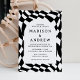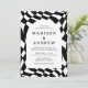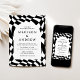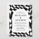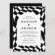 Erleben Sie den besonderen Tag mit den stilvollen Retro Black and White Checkerboard Einladungen! Die Einladung zeigt Ihre Namen und Hochzeitsdetails in schwarzer Schrift, umgeben von einem weißen Bogenrahmen. Der Hintergrund weist ein abstraktes Schachbrettmuster mit schwarz-weißem Farbschema auf.