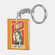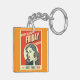 Add a touch of vintage flair to your daily essentials with this eye-catching accessory. Featuring a scaled-down version of a retro black friday advertisement, this piece highlights a detailed pin-up girl and classic mid-century aesthetic. The bright red cream graphics ensure your keys are easy to find, while the 1950s illustration style adds a unique pop art personality to your keyring. It is a perfect small gift for collectors of comic book style memorabilia and kitsch fashion.