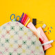 Mit diesem Rucksack und seinem Vintagen Blumenmuster verleihen Sie jedem Outfit einen Retro-Stil. Geometrische Darstellungen von Gänseblütenfarben in hellblauen, dunkelgrünen, rosa, rostorangen und gelben Farbtönen sind Set gegen einen Sand oder beige Hintergrund für einen einfachen Retro-Look.