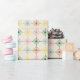 Mit diesem Verpackungspapier und seinem Vintagen Blumenmuster lassen sich Geschenke stilvoll zusammenstellen. Geometrische Darstellungen von Gänseblütenfarben in hellblauen, dunkelgrünen, rosa, rostorangen und gelben Farbtönen sind Set gegen einen Sand oder beige Hintergrund für einen einfachen Retro-Look.
