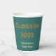 Die Klasse 20xx erscheint in einem großen orangefarbenen Schriftart über zwei Grauzeilen für den Namen und die Schule des Absolventen. Alle Texte können bearbeitet oder gelöscht werden. Das Gefallen-Tag hat eine Retro-Farbpalette im 70er-Stil mit blau-grün und orange gedämpft.
