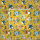Hübsches Blumengewebe mit einem auffälligen Blumenmuster bedruckt in einem starken Senfgelb mit Retro-Blume in Rot, Korallen und Blau mit vielen blauen und grünen Blätter und hellen Beeren.