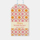 Feiern Sie Ihre Hochzeitsdusche im Retro-Stil mit diesen personalisierten Hochzeitsdusche-Geschenkanhängern mit einem charmanten Retro-Blumen-Ogee-Muster. Entworfen mit rosa und orangefarbenen Blumen, die zwischen kühnen roten Ogee-Formen auf einem warmen beigen Hintergrund eingebettet sind,