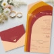 Klassische Vintage 70er Retrofarben mit gewölbten Bogenreihen, die alle in einer Hochzeitseinladung zusammengefasst sind. Cooles Design mit Hippie-Farben Creme, Orange und Rot. Personalisieren Sie es, indem Sie die Braut und Bräutigam Namen und Hochzeitsdetails.
