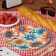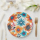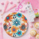 Ein fabelhafter Boho Blume Party Teller. Dieses farbenfrohe 70er Jahre vibe Blumendesign zeichnet sich durch farbenfrohe Power-Blume in Orange und Blau aus. Ein wunderschönes Retro-Geschirr-Design, das sich von der Masse abhebt.