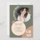 Runden Sie sich ein und feiern Sie! Unsere modernen, eleganten Boho Einladungen sind die perfekte Art, Ihren Abschluss im Stil anzukündigen. Mit einem feinen Schriftart mit bearbeitbaren Retro-Grün, Braun und Rot und Kreise Formen, fügen Sie 5 Ihrer Lieblings-Fotos. laden Sie Ihren Gast zu Ihrem offenen Haus und verkünden Sie Ihren Abschluss in Stil.