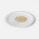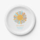 Teller für kundenspezifisches Papier. Entworfen mit einer Retro Boho Sonne in einem orangen gelben mit hellblauen Sonnenlicht. Stöbern Sie in unserem Bohemischen Sunshine Theme für die passenden Waren aus Papier und Party. Napkins, Einladungen, Dankeschön-Karten, Babydusche, Spiele und mehr