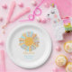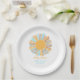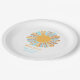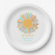 Teller für kundenspezifisches Papier. Entworfen mit einer Retro Boho Sonne in einem orangen gelben mit hellblauen Sonnenlicht. Stöbern Sie in unserem Bohemischen Sunshine Theme für die passenden Waren aus Papier und Party. Napkins, Einladungen, Dankeschön-Karten, Babydusche, Spiele und mehr