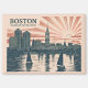 Dieses Kunstwerk vereint die Skyline des Boston Charles River, eine der bekanntesten Aussichten an der Uferpromenade von Neuengland, mit Segelbooten, die unter einem strahlenden Sonnenuntergangshimmel über den Fluss treiben. Es ist im Stil eines Retro-Vintage-Reiseplakats konzipiert und zeichne Einfluss aus der modernen Illustration der WPA Mitte des Jahrhunderts. Es verbindet kühne, saubere Linien, vereinfachte Formen, texturierte Schattierung und nostalgische Americana-Töne. Der beeindruckende Aussichtspunkt unterstreicht sowohl die historische Architektur Bostons als auch die modernen Wolkenkratzer, die mit der Schiffstradition des Charles River ausgeglichen sind. Palmenähnliche Silhouetten von Masten und der strahlende Sonnenbrand schaffen eine landschaftliche Komposition, die mit patriotischem Stolz, nostalgischem Charme und zeitloser urbaner Vitalität gefüllt ist. Dieses Design ist eine Hommage an Boston, Massachusetts und verbindet Architektur, Segelboote, Sonnenuntergangshorizonte und städtische Sehenswürdigkeiten zu einem Bild, das den Tourismus, das Kulturerbe und die Erinnerungen des Urlaubs weckt. Das klassische und lebendige Hotel feiert die anhaltende Rolle der Stadt als berühmtes amerikanisches Reiseziel.