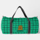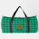 Bezaubernde Duffeltasche mit niedlichem Cartoon brauner Kartoffel. Der Hintergrund ist ein niedliches Retromuster eines schwarzen Rasters über einer aquamarinen, kräftigen Farbe. Eine Vorlage am Ende der Kartoffel, um Ihren Namen hinzuzufügen.