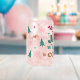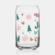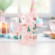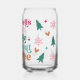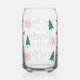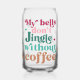 Dieses spielerische Glas enthält Retro Bright Weihnachtssymbole und Text, in dem steht: "Meine Glocken klingeln nicht ohne Kaffee." Die Farben sind rosa, rot und grün.