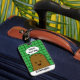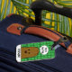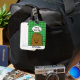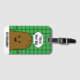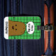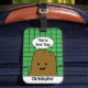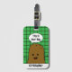 Ein schönes Gepäckanhänger mit einer niedlichen, fröhlichen braunen Kartoffel aus Cartoon mit "This is your bag" in einer weißen Sprechblase über seinem Kopf geschrieben. Der Hintergrund ist ein niedliches Retromuster eines schwarzen Rasters über einer kräftig grün gefärbten Farbe. Eine Vorlage unten, um Ihren Namen hinzuzufügen.