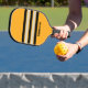 Retro Bumblebee Buzz Across Striping mit Name Pickleball Paddle strahlt energetische Lebhaftigkeit aus und vermischt fett gelbe und schwarze Töne, die Bewegung und Rhythmus auf dem Hof suggerieren. Sein lebendiges Design verleiht jeder Kundgebung Persönlichkeit und Flair und macht jedes Spiel zu einem gefühlvollen Ausdruck der Individualität. Ideal für Spieler, die dynamische Spiele mit auffallendem Stil kombinieren, verwandelt es jedes Spiel in eine Feier des Charakters und der Energie des Aufschwungs.