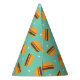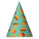 Käseseburger im Retrostil und Pommes frites mit kleinen weißen Herzen auf einem blauen Party Hut.