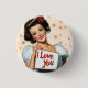 Eine lebendige Illustration im klassischen Button-Up-Stil der 1950er Jahre. Das Bild zeigt eine glamouröse Frau mit Vintagen Vorgängen, kühlem Make-up und einem strahlenden Lächeln. Sie hat ein Zeichen mit einer liebevollen Botschaft, "I Liebe You", Set vor einem Hintergrund von zarten rosa Rosen. Die Gesamtästhetik erfasst das romantische und spielerische Ambiente der mittelalterlichen Button-Up-Kunst.