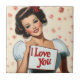 Eine lebendige Illustration im klassischen Button-Up-Stil der 1950er Jahre. Das Bild zeigt eine glamouröse Frau mit Vintagen Vorgängen, kühlem Make-up und einem strahlenden Lächeln. Sie hat ein Zeichen mit einer liebevollen Botschaft, "I Liebe You", Set vor einem Hintergrund von zarten rosa Rosen. Die Gesamtästhetik erfasst das romantische und spielerische Ambiente der mittelalterlichen Button-Up-Kunst.