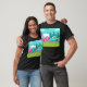 Dieser Retro Camper-/Anhänger-und Auto-T - Shirt kennzeichnet eine moderne Mitte des Jahrhunderts, unbedeutendes Cartoonzeichnen, das Sie verlässt vorzubereiten, um zur offenen Straße zu nehmen. Eine Ehrerbietung zu den fünfziger Jahren, dieses Ausrüstungsbeschreibungen ein Vintages Türkisauto mit der weißen Spitze, einen kitschy Reiseanhänger zu seinem abschließenden Bestimmungsort ziehend. Der tadellos wieder hergestellte, Retro RV hat eine Pink, weiße Spitzenhälfte der unteren hälfte und einen Türkisblitzbolzen, der die zwei trennt. Die Tür in der Seite des Campers ist auch Türkis. Der abschließende Akzent ist der Flügel des heißen Rosas, der von der Rückseite dieses Zuhause auf Rädern hervorsteht. Die glücklichen Menschen fahren hinunter eine graue Straße. Die Fahrbahn wird durch Stoff, grünes Gras umgeben. Im Hintergrund können wir die aquamarinen Silhouetten eines wirklichen Waldes der Zedernbäume, gegen einen Aquahimmel mit den geschwollenen, hellblauen Wolken sehen. Dieser Entwurf ist für jeder von pensioniertem Hippies, von Vogel-Hipstern oder von jedermann perfekt, der will, um einige große Kindheits-Erinnerungen wieder zu erleben. Das beste Teil ist, dass niemand fragt, "sind wir dort schon?"