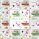 Muster mit Illustrationen von roten und grünen Vintagen Campern, Flamingos, Bienen, Butter und Blumenmotive.