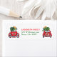 Ein kleines rotes Retroauto wird mit einem Weihnachtsbaum und Geschenkpaketen auf diesem niedlichen Rücksendetikett beladen. Auf der links Seite kommt das Auto in Richtung Betrachter und auf der rechten Seite geht es weg. Ihr eigener Text ist in der Mitte rot und grün passend. Niedlich!