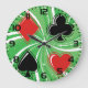 Bring a lively pop of color to your wall with this clock showcasing striking red and black card suits on a swirling green background. The dynamic retro artwork adds energy to game rooms, living spaces, offices, or themed decor. With crisp printing and clean design, this clock is both functional and stylish, making it a great choice for fans of bold graphic art or casino-inspired aesthetics.
