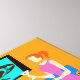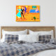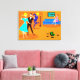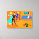 Dieses Retro Cartoon Cocktail Party Stretched Leinwand hat keinen introvertierten Knochen in seinem Körper! Das moderne Design aus der Mitte des Jahrhunderts besticht durch einen lebhaften Cartoon, der von einem Wohnzimmer und einem lebhaften Party mit Cocktail zeichne. Auf der Tanzfläche gibt es ein attraktives Paar. Die blonde Frau in einem türkisfarbenen Kleid und ihre große, dunkle und gut aussehende Begleitperson tanzen den Cha-cha. Auf dem Boden befindet sich ein grüner Schallplattenspieler, der von Vinyl-Platten umgeben ist. An der hinteren Wand sitzt ein schöner Rotkopf auf einem blauen Sofa. Sie trägt ein leuchtend rosa Kleid. Ihr einziges Zubehör ist das Martini-Glas in ihrer Hand. Auf ihrer Seite ist eine Bodenlampe ohne Schatten. Wo ist der Schatten? Es ist auf dem Kopf eines zaghaften Mannes in einem blauen Anzug, der eindeutig das Leben des Party ist. Er hält auch ein Martini-Glas. Wer das Zimmer dekoriert hat, hatte keine Angst vor Farbe. Es hat eine orangefarbene Ziegelwand und einen orangefarbenen Boden. An der Wand hinter dem Sofa hängt ein aquamarines türkisfarbenes Bild eines schwarzen Globus.