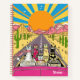 Journal in an illustration of five stylishly dressed cats wearing sunglasses ride in a pink convertible through a vibrant desert landscape. The backdrop features cacti, mountains, and a radiant, setting sun. The whimsical, pop-art style evokes a playful, retro road trip vibe.