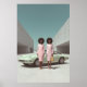 Zwei elegante Frauen mit voluminösen Afros und pastellrosa Kleider stehen neben einem minzgrünen Oldtimer in einem eleganten, minimalistischen architektonischen Rahmen. Die Szene verbindet Retroästhetik mit modernem Minimalismus, der Eleganz und Stil ausstrahlt.