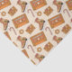 A fun holiday late 70s-early 80s retro illustrated pattern with cassette tapes of holiday mixes, intricately detailed ice skates, ornaments, gifts, and candy canes.
