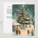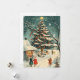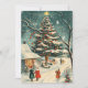 Treten Sie ein in ein nostalgisches Winterwunderland mit dieser wunderschön illustrierten Weihnachtskarte, die eine bezaubernde Dorfszene umgibt, die sich um einen großen, festlich dekorierten Weihnachtsbaum dreht. Die schneebedeckte Landschaft, die von funkelnden Lichtern und fröhlichen Dorfbewohnern geschmückt ist, erweckt den Zauber eines traditionellen Feiertags. Diese Karte erinnert an die Wärme und den Gemeinschaftsgeist klassischer Weihnachten und ist somit perfekt geeignet, um Ihnen herzliche Urlaubswünsche zu geben. Auf der Rückseite befindet sich eine Meldungsvorlage, mit der Sie Ihren Gruß personalisieren oder für einen handschriftlichen Hinweis leer verlassen werden können. Ideal für diejenigen, die Vintage Urlaubskunst und zeitlose Weihnachtstraditionen Liebe haben.