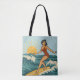This sunny surf themed tote is the perfect beach bag and a great way to to haul your daily essentials. The retro-inspired art features a surfing pin-up model riding an endless wave beneath the blue sky and shining sun. Designed with old-school California energy, the distressed look gives it an authentic feel, like it was pulled straight from a vintage surf shop. Show off your love for the waves with this fun tote bag.