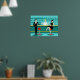 Mit diesem Retro Cocktail Lounge Poster ist jede Stunde eine Happy Hour. Das moderne Design aus der Mitte des Jahrhunderts besticht durch einen lebhaften, minimalistischen Stil der 1960er Jahre, einen Cartoon, der von einem klassischen Cocktail-Bar zeichne. Vor der Kulisse einer Wasserwand können wir eine Reihe von Gläsern sehen. Zumindest können wir die aquamarinen Silhouetten von Trinkgläsern sehen. Aufgrund der Gestalt des Stickereis ist dieses Bar gut ausgestattet, um Ihre Pfeife zu nassen, ganz gleich, was Ihr Getränk bevorzugt. Ein kompetenter und persönlichster Barkeeper ist die Besetzung des aquamarinen Bar mit gelben Akzenten. Der junge Barkeep trägt ein unberührtes, weißes Shirt mit schwarzer Bogen-Krawatte. Sein frisch aussehendes gutes Aussehen, seine blonden Haare und seine schwarzen Hipster-Brillen geben uns allen Grund zu der Annahme, dass er entweder seine Tage als Schauspieler oder Superheld verbringt. Auf der einen Seite gibt der hübsche Mixologe einem Kunden auf der anderen Seite der Bar einen Martini. Der gewartet Kunde ist ein weitläufiger Gentleman in schwarzem Anzug und roter Krawatte. Er ist der Typ, der als groß, dunkel und gut aussehend beschrieben wird, selbst wenn es noch Stunden bis zum Ende der Zeit ist. Es scheint einen roten und chromen Bar mit dem Namen von Herrn Debonair zu geben. Doch um nicht vorauszusehen, frage er die Frage: "Entschuldige mich. Ist dieser Platz besetzt?" Er frage den ravenhaarigen Gal auf dem benachbarten Bar. Sie ist ein richtiger Typ von "Mädchen nebenan", wenn Sie zufällig neben einer makellosen Schönheit leben, mit einer Figur, die nicht aufhören wird. Sie trägt ein schwarzes Kleid und hält einen Martini in einer Hand. Sie hofft, dass sie und der nahende Gentleman mehr gemeinsam haben, dass ihre Getränkevorlieben und die Wahl der Kleiderfarbe. Es sieht so aus, als got dieser Abend einfach interessant. Herzlichen Glückwunsch!
